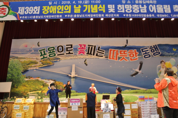 오늘은 제39회 장애인의 날 기념식 및 희망충남 어울림 축제가 있는 날 입니다. 윤봉길체육관에 열린 행사에는 충남의 각 지역에서 모인 장애인분들과 관계자들로북적였으며 공연과 감사패 전달, 노래자랑으로 열띤 분위기를 이루었습니다. 아름다운집 이용인(김*희, 이*미, 박*순)도 자리에 함께 했습니다.