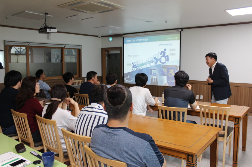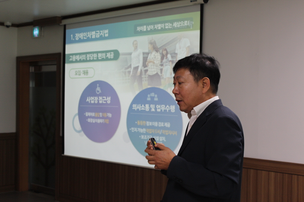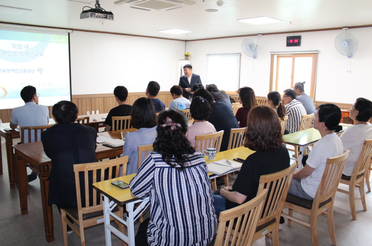 아름다운집은 상시근로자 50인 이하 시설이므로 장애인 근로자 의무 고용 기관은 아니지만 법적 의무 교육이기도 하고, 장애를 가진 이용인들과 함께 생활하는 공간으로이번 기회에 전 직원이 함께 모여 외부강사에게 교육을 받았습니다. 집합 교육에 참여하지 못한 직원들은 교육자료를 배포하여 진행했습니다.