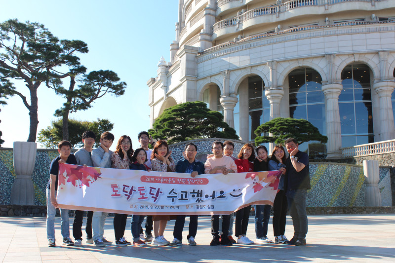 *힐링연수사업비는 충남도와 예산군에서 해마다 지원해주고 있습니다. 그동안은 소인원으로 해외를 다녀왔었는데 금년에는 직원 채용의 어려움으로 해마다 진행하던 직원워크숍을 접고 많은 직원이 참여하는 방향으로 변화를 주었습니다. 평창의 하늘목장, 낙산사, 하조대, 주문진항 등 유명관광지 여행도 하고 싱싱한 해산물을 실컷 맛보며, 솔비치대명리조트 예쁜 곳에서 숙박하면서 그동안 못다했던 이야기를 나누며 재충전 했습니다. 1박2일의 여행을 통해 얻은 소중한 힐링의 추억으로 금년 남은 날들을 힘내어 이용인 서비스에 팍팍 쏟겠습니다. 모두 모두 수고하셨습니다.
