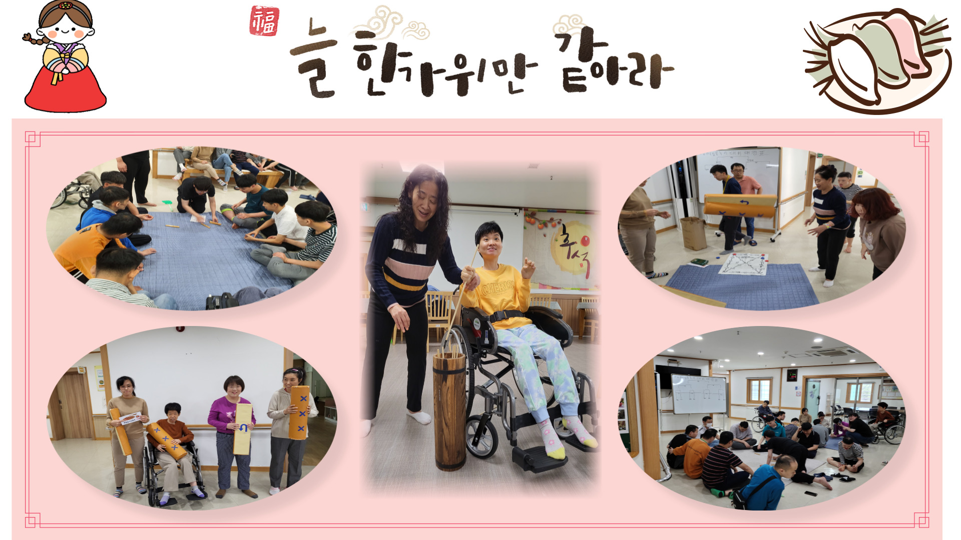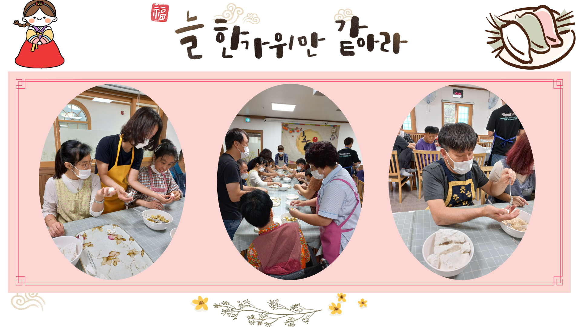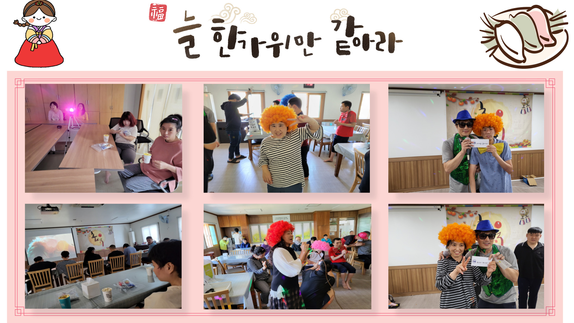 온 가족이 모일 수 없는 안타까움이 있지만 마음만은 함께하는 행복한 시간 보내시고, 올 한해의 풍요와 건강을 기원하며 언제나 평안하시기를 두 손 모아 소원합니다.아름다운집의 식구들은 한가위를 맞이하여 어울림 한마당 행사를 통해 즐거운 시간을 보냈습니다.
