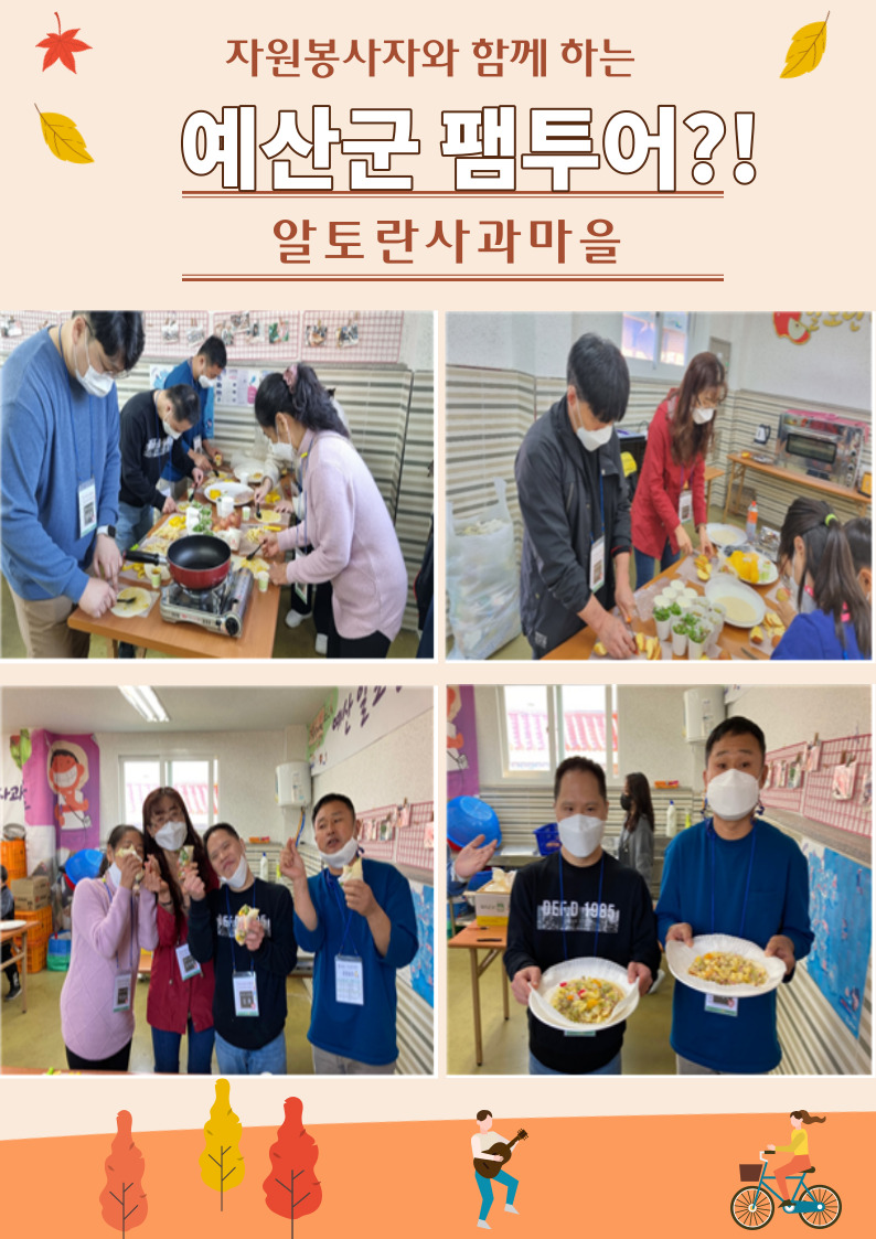 야트막한 산기슭에 자리한 알토란사과마을에서 봉사자와 함께 예산특산물인 사과를 이용하여 디저트를 만들어 먹는 색다른 경험이 따사롭고 정겨우면서 행복한 시간이었습니다.^^(11.6 멋진 가을날에)