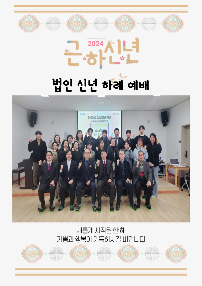 법인 이사장님과 상임이사님을 비롯하여 여러 이사님들과 아름다운집, 예산군장애인보호작업장, 좋은재가복지센터 직원들이 아름다운집 다목적관에서 신년 하례 예배를 드렸습니다.모두들 새해에는 좋은 일들만 가득하시기를 바라며, 모두 건강하세요.~~^^
