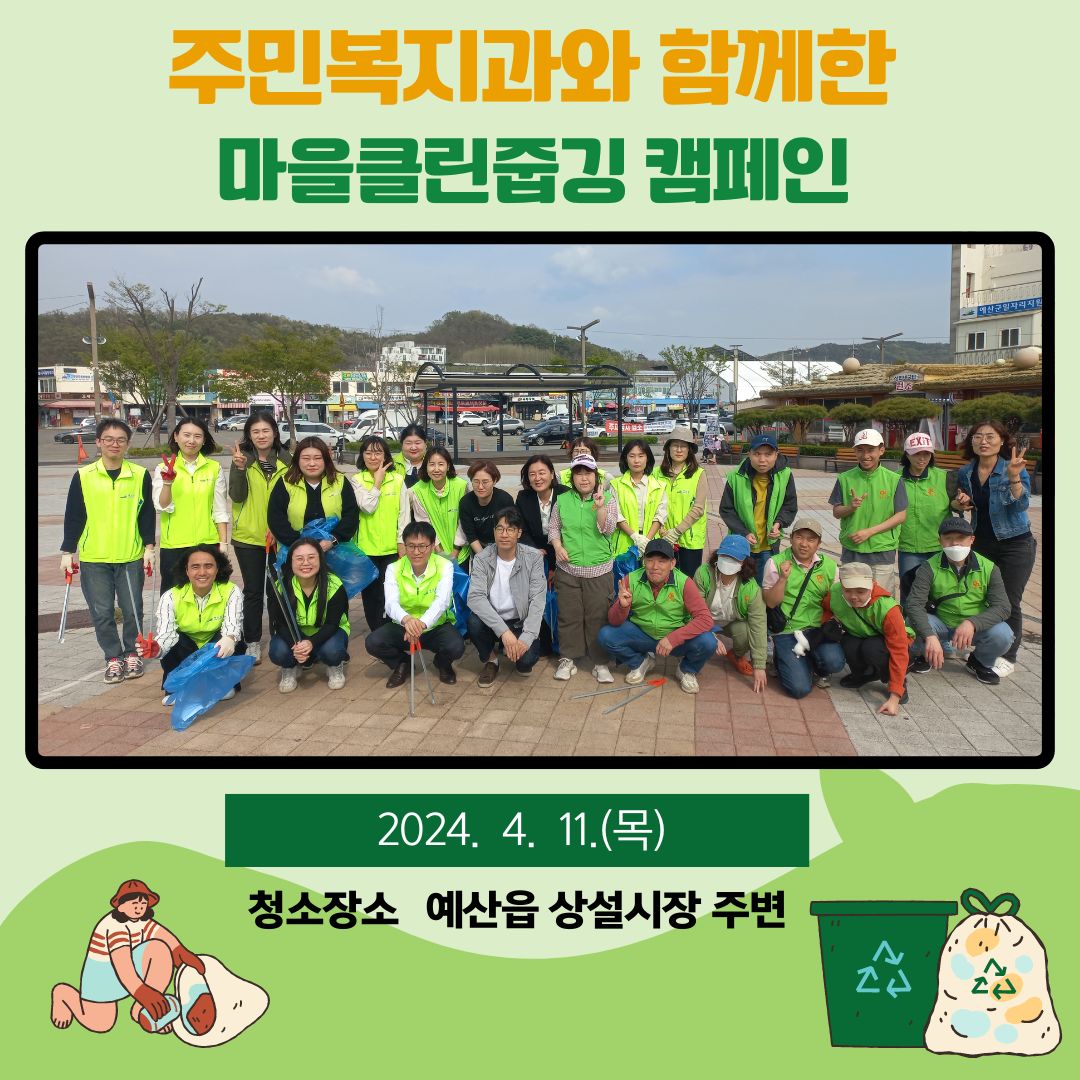 주민복지과 직원들과 아름지기봉사단 회원들이 예산읍 상설시장 주변을 깨끗이 청소하였습니다.저희 아름지기봉사단과 함께 플로깅 활동을 원하시는 지역주민들은 언제나 환영하오니 언제든 기관으로 연락주세요~~^^
