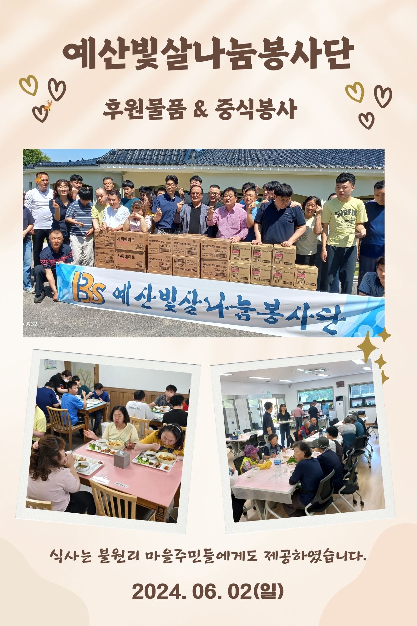 예산빛살나눔봉사단 회원들이 맛있는 비빔밥과 삼겹살을 우리 이용인들과 불원리 마을주민들에게 식사를 대접해 드렸고, 후원물품도 전달해 주셨습니다. 봉사단 회원분들께 매우 감사합니다.~~^^